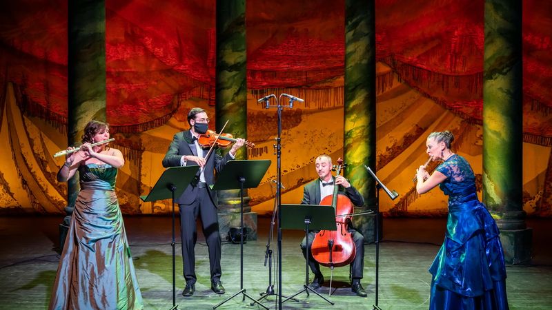 Az Opera Zenekar programjában olyan zeneszerzők műveivel ismerkedhettek meg a közvetítés nézői, akiknek más komponistákra gyakorolt hatása igen jelentős. Saverio Mercadante (1795–1870) népszerű olasz szerző volt, s bár az utókor kevéssé ismeri, operáinak felépítése, dallamvezetése és hangszerelése nagy hatással volt Verdire. Fuvolára, angolkürtre, hárfára és csellóra komponált F-dúr szerenád című darabját Biró Zsófia, Baráth Nóra, Simon Beáta és Stankowsky Endre zenekari művészek szólaltatták meg. A londoni Bachként is ismert koraklasszicista zeneszerző, Johann Christian Bach (1735–1782) munkássága Mozartra volt nagy hatással, akinek gyermekkorában több hónapon át tanítója is volt a brit fővárosban. C-dúr fuvolakvartettjét (W.B 64) V. Menyhárt Zsuzsanna, Gjorgjevic Dóra (fuvola), Dóczi Áron (hegedű) és Boldoghy Kummert Péter (cselló) adta elő. A műsorban a „kis” tanítvány egy darabja is helyet kap. Wolfgang Amadeus Mozart (1756–1791) már sikeres zeneszerzőként többször utalt arra, hogy mennyit köszönhet londoni mesterének. Kürtkvintettjének I. tétele Benyus János (kürt), Nagao Haruka (hegedű), Kondor Péter (brácsa), Tóth Balázs (brácsa) és Fejérvári János (cselló) tolmácsolásában hangzott el.